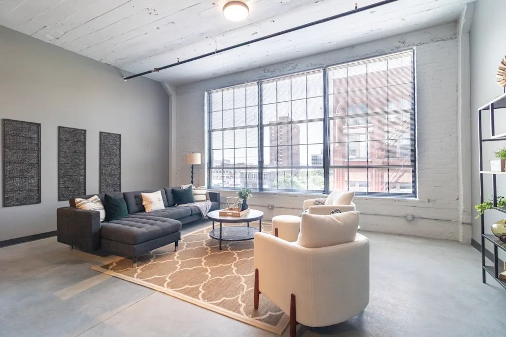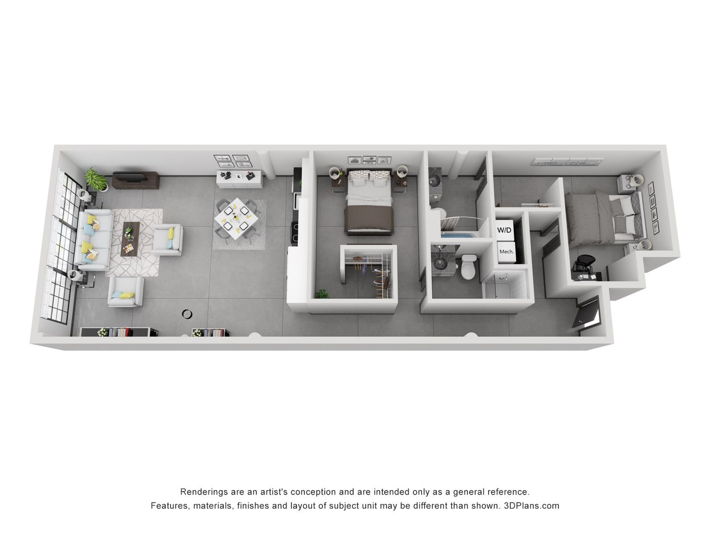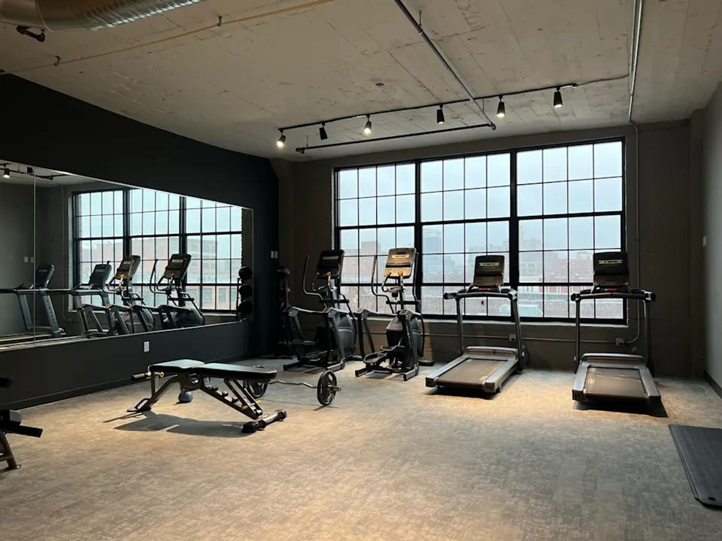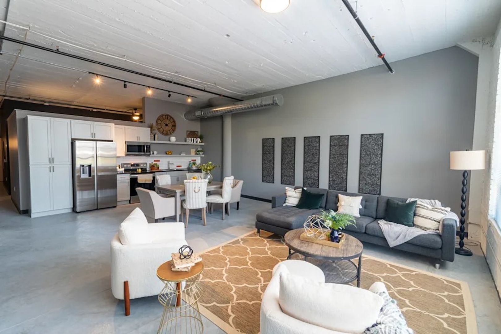 Inside each apartment, industrial features like sealed concrete floors, exposed concrete ceilings & walls, and historic replica aluminum windows are complemented by modern touches. All units include stainless steel appliances, a full-size washer/dryer, ceiling fans, and floor-to-ceiling windows.