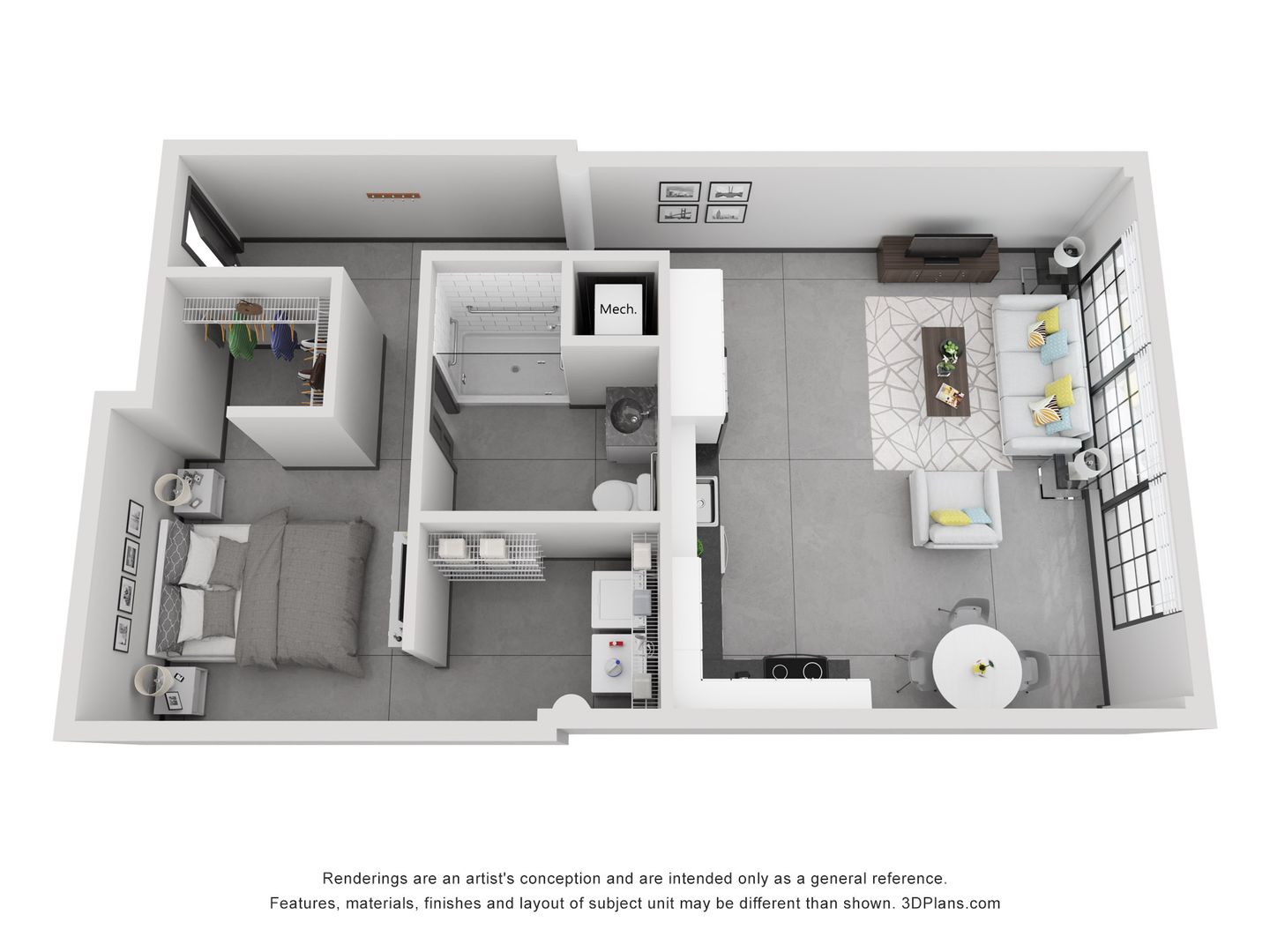 Inside each apartment, industrial features like sealed concrete floors, exposed concrete ceilings & walls, and historic replica aluminum windows are complemented by modern touches. All units include stainless steel appliances, a full-size washer/dryer, ceiling fans, and floor-to-ceiling windows.