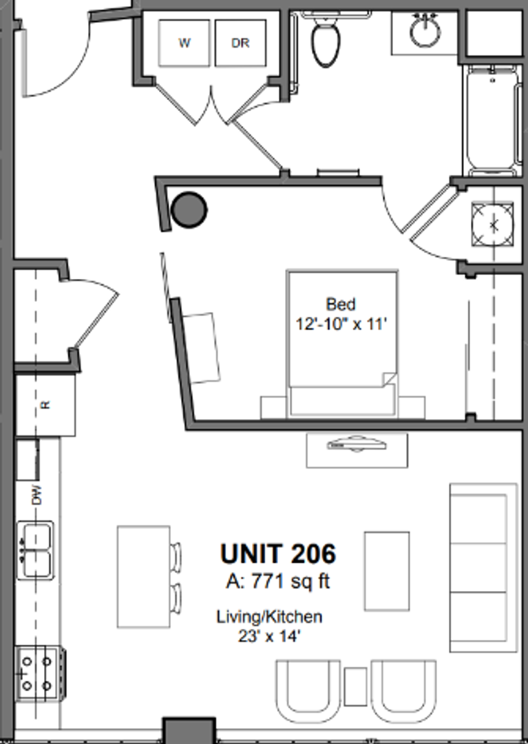 Each apartment comes with in-unit washer/dryer, stainless steel appliances, spacious kitchens, quartz countertops, and efficient LED lighting throughout. Most of the apartments also feature a kitchen island, and some have a sidebar with additional cabinetry above. The building has an elevator to make moving easier, as well as a trash chute on the 2nd and 3rd floors so you don't have to lug your garbage all the way to the dumpster in the garage. Complimentary bike storage is provided on the 1st floor, along with dedicated storage enclosures in the garage for $35/mo, pending availability.