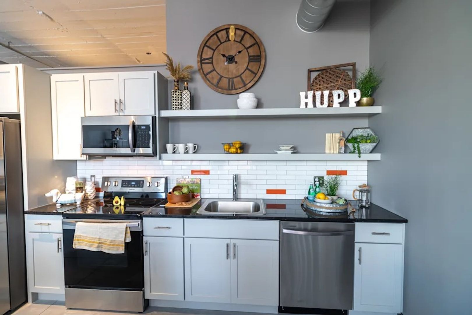 The Lofts at the HUPP, once a prominent Chevrolet dealership, is now a premier loft-style apartment building located in Downtown West St. Louis. Our 1 and 2 bedroom homes seamlessly blend industrial accents – a tribute to the building's automotive past – with modern design.  Enjoy attractive amenities including a clubroom with a coffee bar, multiple lounge spaces with 65" smart TVs, a fitness center, and an outdoor entertainment deck with downtown views.  Assigned parking is available in our on-site garage or gated lot.